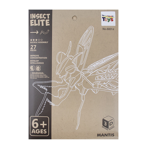 Набор состоит из 27 деревянных деталей. Из них собирается объемная модель богомола. Детали соединяются друг с другом без клея. Сборка требует внимания и точности. Это тренирует моторику рук и пространственное мышление. Собранная модель становится цельной фигурой. Ее можно использовать для игры или как элемент интерьера.