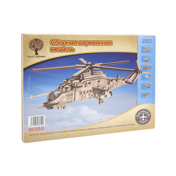 Сборная модель деревянного вертолета М-24, состоящая из 117 деталей. У нее много элементов, повторяющих детали реального летательного транспортного аппарата. Все части конструктора выполнены из экологически чистой древесины. Их необходимо выдавить из общего полотна и аккуратно соединить, следуя инструкции. С готовой игрушкой можно играть или использовать ее как декоративный элемент.