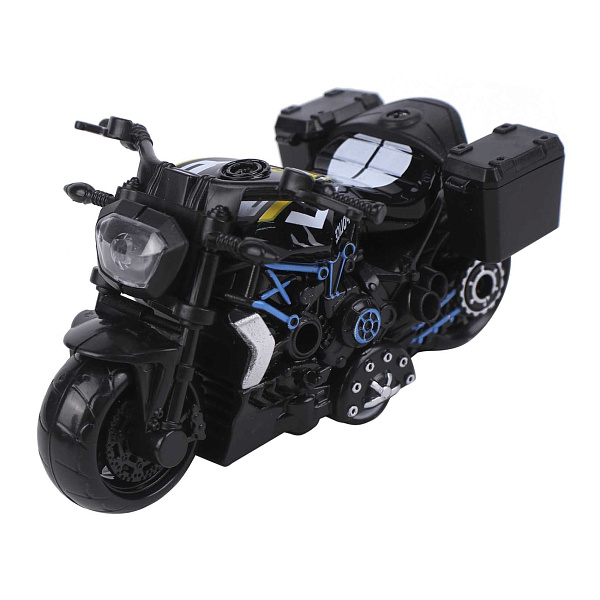 Черный цвет корпуса сочетается с динамичными синими акцентами, придавая мотоциклу стильный и современный вид. Инерционный механизм обеспечивает плавное движение без необходимости в батарейках — достаточно немного оттянуть модель назад и отпустить, чтобы она устремилась вперед.