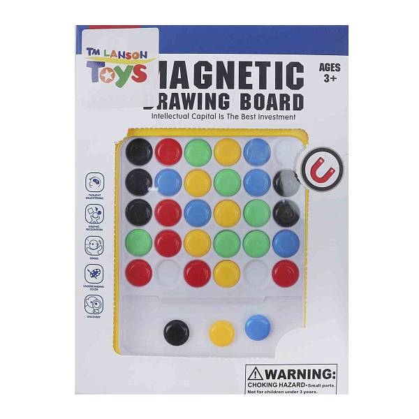 Мозаика магнитная - это компактная и увлекательная игрушка для детей от 3 лет, которая развивает цветовое восприятие, логику и творческое мышление. Изделие выполнено в виде прочного пластикового планшета ярко-желтого цвета с гладкой белой рабочей поверхностью, размеченной под круглые ячейки. В комплект входят разноцветные магнитные фишки - красные, синие, зеленые, желтые, черные и белые, - которые легко фиксируются на поле и не выпадают при переноске. На задней стороне планшета предусмотрена удобная ручка, а в специальном отсеке хранятся запасные элементы.