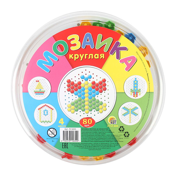 Круглая мозаика – это набор из 80 элементов, который создан, чтобы дети могли погрузиться в мир творчества и игры. В комплекте детали четырех ярких цветов размером 13 мм, которые легко подходят друг к другу.