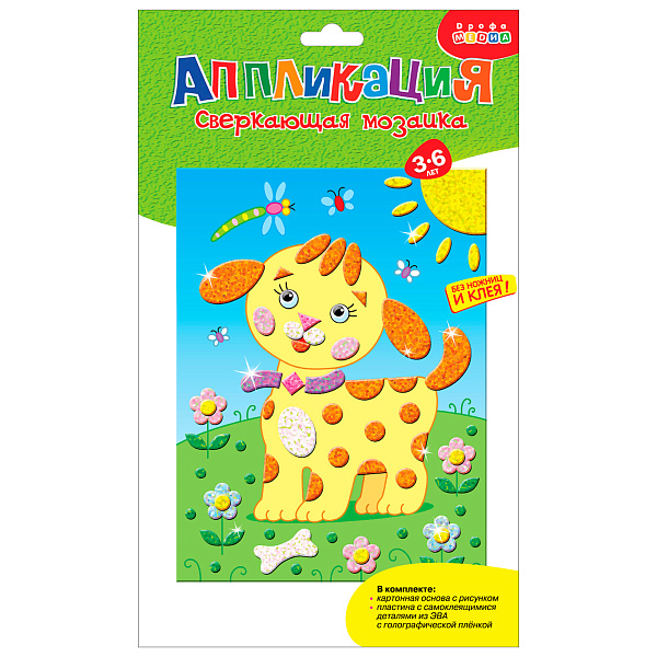 Отличный подарок для тех, кто только начал познавать животный мир. Малышам начиная с 3-х лет рекомендуем эту аппликацию. Сверкающий Щенок построен из качественного картона: основа с рисунком, вместе с пластиной и самоклеящимися деталями из ЭВА позволят малышу получить удовольствие при сборке.
