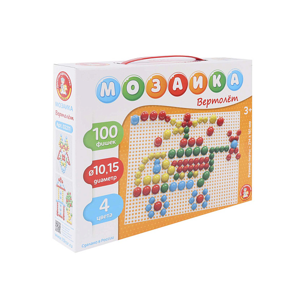 Занятия с мозаикой «Вертолет» принесут ребенку радость, помогут стать внимательнее, усидчивее. Данный комплект состоит из платы и 100 пластиковых фишек 4 цветов и 2 размеров (15 и 19 мм).