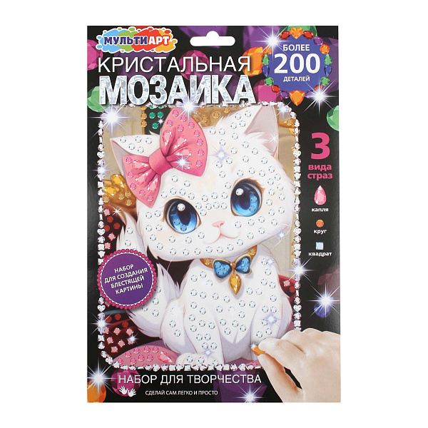 Мозаику легко собрать благодаря самоклеящимся стразам, которые отличаются не только цветом, но и формой. В комплекте предусмотрены стразы в виде капли, круга и квадрата.