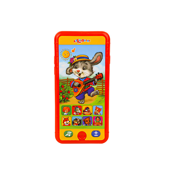 Красный мультиплеер с ярким изображением зайца в красной рубахе с белыми пятнами, синей окантовкой, зеленым поясом, в синих штанах с балалайкой в руках. Заяц находится на фоне забора и кустов с цветами. В нижней части мультиплеера находится 8 иконок с изображением разных персонажей. При нажатии они запускают музыку. Зеленая кнопка с нотой выключает или включает звук, а синяя – понижает или повышает громкость его звучания. Работает от батареек (в комплекте), в программе – 50 песенок, по 5 на каждой кнопке. Дополнительно можно скачать караоке и 15 потешек.