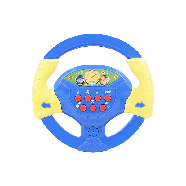 Игрушка изготовлена из прочного пластика, устойчивого к падению. Руль мигает цветными лампочками и издаёт 20 разных звуков автомобильной тематики. Управление производится при помощи кнопок. Сами кнопки крупные, мягкие, нажимаются отлично. Руль обладает регулировкой громкости. Верхний ряд кнопок на руле позволяет включить звуковые эффекты. Крайняя правая кнопка включает один из 14 звуков на выбор: сигнализация, сирена, клаксон, торможение и прочие.