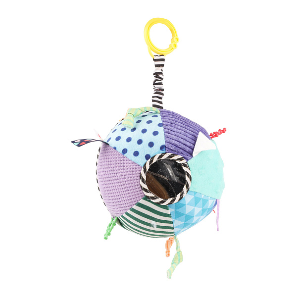 Разнообразные яркие цвета и текстуры стимулируют развитие зрительного восприятия и тактильные навыки младенцев. Мячик оснащен желтой ручкой, удобной для захвата маленькими руками ребенка, что делает игрушку идеальной для проведения времени на полу или в кроватке, где малыш может свободно катать и изучать ее свойства.