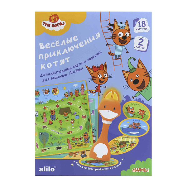 Набор Abumba «Веселые приключения котят» - это интерактивный комплект для игр и обучения, разработанный для детей от 0 до 3 лет. Набор включает в себя две большие двусторонние карты и 18 маленьких карточек с заданиями.
