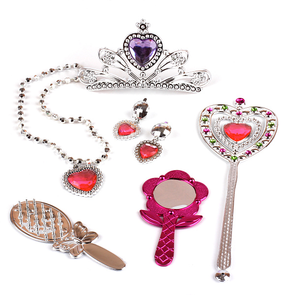 О наборе украшений с крупными блестящими кристаллами мечтает каждая девочка. Мечта становится реальностью, ведь набор включает в себя серебряную диадему, украшенную фиолетовым кристаллом, пару сережек-клипсов, подвеску-сердце на цепочке, имитирующей нитку жемчуга, волшебную палочку, а также небольшое зеркальце в форме цветка розового цвета и серебряную расческу для волос с декором в виде бабочки на рукоятке.