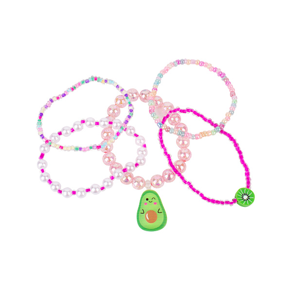 Пять браслетов разных дизайнов из набора «Авокадо» придутся по вкусу юной моднице. Первый браслет выполнен из крупных перламутрово-розовых бусин с подвеской в виде зеленого авокадо с глазами, ртом и коричневой косточкой. Второй – из малинового бисера с вставкой дольки зеленого киви. Третий – из разноцветного перламутрового бисера пастельных тонов. Четвертый – из крупных перламутровых бусин, чередующихся с малиновым бисером. Пятый – из прозрачного бисера с цветными вставками-капельками. Обилие дизайнов позволит ребенку с малых лет создавать новые образы, а также знакомиться с миром моды и стиля. рекомендовано для детей с 3 лет.