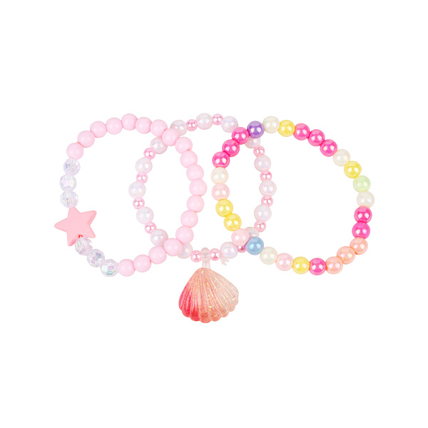 В набор входят три браслета из пластмассовых бусин с вставками морской тематики. Один браслет выполнен из гладких розовых и граненных прозрачных бусин, с кулоном в виде розовой морской звездой. Второй выполнен с чередованием крупных белых и мелких розовых бусин, большая ракушка с градиентом и блестками располагается в середине браслета. Третий выполнен разноцветных бусин. Резинка браслетов растягивается и подойдет на любую руку. Браслеты порадуют маленькую модницу. Три непохожих дизайна позволят подбирать новый образ. Браслеты можно носить по одному или всем набором сразу. Рекомендовано для детей старше 3 лет.