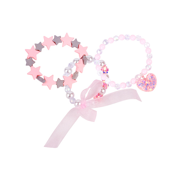 Набор «Нежно-розовые грезы» из трех браслетов с фигурными бусинами, лентой и кулоном понравится каждой малышке. Первый браслет состоит из крупных розовых звезд, которые чередуются с мелкими серыми. Второй – из крупных перламутровых бусин с прозрачными граненными вставками и тремя блестящими розовыми бусинами. Перевязан розовой лентой. Третий браслет – из нежно-розовых бусин среднего размера, которые чередуются с граненными прозрачными и кулоном в виде сердца с круглыми блестками внутри. Скрепляются упаковкой с серой надписью бренда. Все браслеты изготовляются из пластика. Рекомендовано для детей с 3 лет.