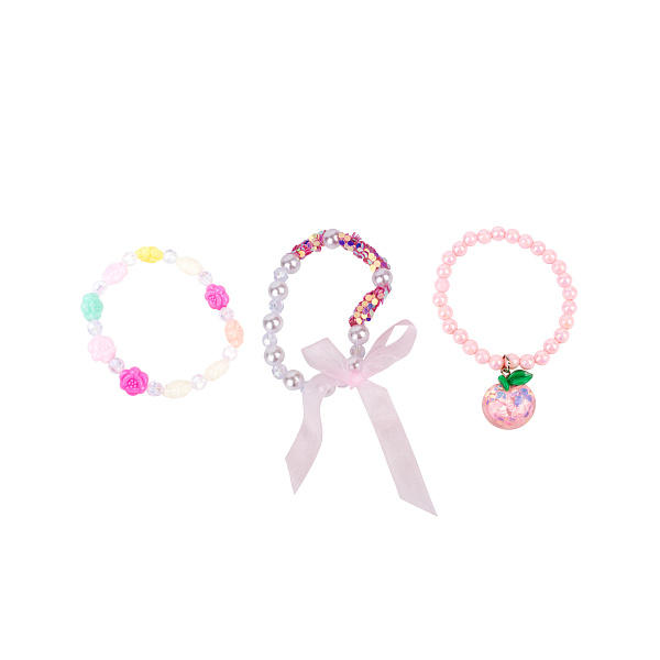 Три браслета непохожих дизайнов из набора «Вишенка» – как раз для модницы! Украшения можно комбинировать друг с другом, а также носить вместе или отдельно друг от друга. Браслеты легко растягиваются и подойдут для запястья с любым обхватом. Первый браслет состоит из двух видов бусин: прозрачных и разноцветных в форме цветов. Второй перевязан розовой лентой и имеет три вида бусин: перламутровых, прозрачных с гранями и цветными пайетками. Третий – с розовым кулоном-вишенкой с зеленым листком. Внутри кулона находятся круглые блестки. С такими аксессуарами ребенок научится создавать новые образы и станет увереннее. Рекомендовано для детей с 3 лет.