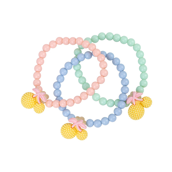 Модные браслеты выполнены в нежной цветовой гамме. Они гармонично дополнят летнюю коллекцию аксессуаров девочки старше 3 лет. Украшения порадуют ребенка, помогут малышке обрести уверенность в себе и сформировать художественный вкус. Гладкие элементы изготовлены из прочного экологичного пластика, в составе которого нет вредных компонентов. Такой материал не впитывает влагу, не царапает кожу, легко отмывается при необходимости. Оригинальная подвеска в виде пары стилизованных ягод делает дизайн бижутерии ярким и притягательным. Набор браслетов "Ягодки" подарит моднице восторг и восхищение!