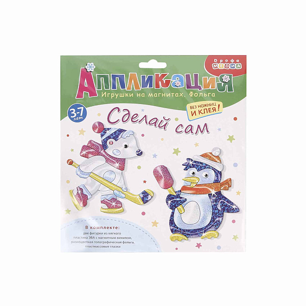 Подарите детям в новогодние праздники немного позитива вместе набором для аппликации «Игрушки на магнитах с фольгой». С ним юные творцы своими руками создадут фигурки пингвина и белого мишки. В комплекте: 2 фигурки из мягкого пластика ЭВА с магнитным винилом, разноцветная фольга и пластиковые глазки. Аппликация создается без клея и ножниц, поэтому не стоит переживать, что ребенок испачкается. В процессе творчества ребенок развивает моторику рук, внимательность и аккуратность. Готовые аппликации станут чудесными магнитами на холодильник.