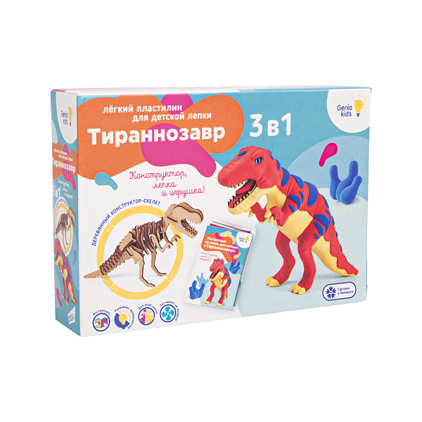 Используемые в производстве материалы не содержат вредных веществ, поэтому безопасны для детского организма. Набор для детской лепки "Тираннозавр" включает: 5 упаковок легкого пластилина, удобный стек, 2 шаблона и стразы для глаз.