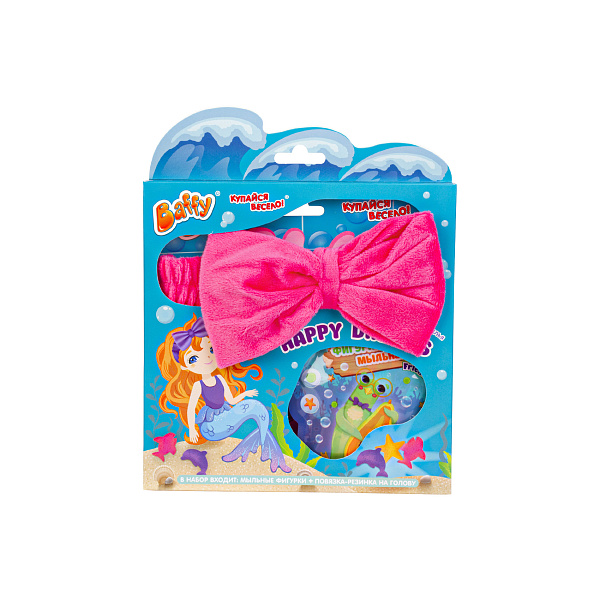 Порадовать девочку старше 3 лет несложно оригинальным подарком для развлечений во время купания. Внутри красочной коробки ребенок найдет фигурное мыло в виде морских обитателей. Их можно наклеить на ровную поверхность, а также использовать для мытья рук. Дополняет комплект мягкая повязка с бантом, предназначенная для защиты волос от попадания мелких брызг.