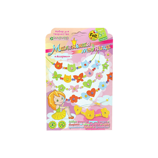Превратите малышку в стилиста, подарив ей творческий набор «Маленькая модница». Набор откроет девочке простор для фантазии. Подберите фетровые фигурки, шнуры и бисеринки по цвету и форме, чтобы создать авторские наборы украшений. В комплекте юная модница найдет: цветные шнуры и разноцветный бисер, фетровые детали и инструкцию. Пошаговые указания на обороте коробки в сопровождении с рисунками помогут ребенку без иглы и ножниц создавать яркие и оригинальные браслеты и колье. В процессе творчества ребенок развивает моторику рук, воображение, усидчивость и аккуратность. Рекомендовано для детей с 5 лет.