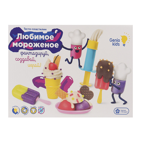 Набор для лепки «Любимое мороженое» от Genio Kids – это идеальный подарок для маленьких творцов. Комплект содержит 6 кусочков разноцветного тесто-пластилина массой по 50 граммов. Основные цвета – желтый, оранжевый, красный, коричневый, кремово-белый и фиолетовый с блёстками, позволяют создавать аппетитное мороженое разных видов, от рожков до эскимо.