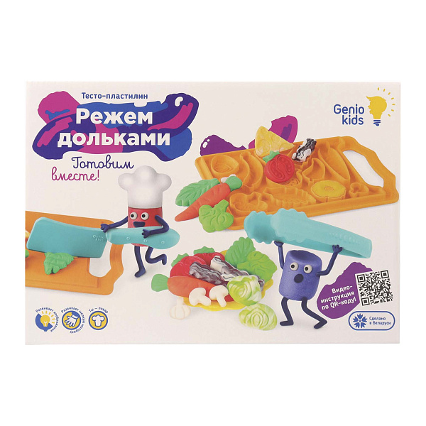 Также в наборе есть щипцы, вилка, нож, тарелка, скалка и доска с формочками фруктов и овощей. Аксессуары выполнены из прочного и безопасного пластика. Этот набор способствует развитию мелкой моторики и координации движений, а также стимулирует воображение. Видеоуроки по QR-коду облегчают начало занятий.