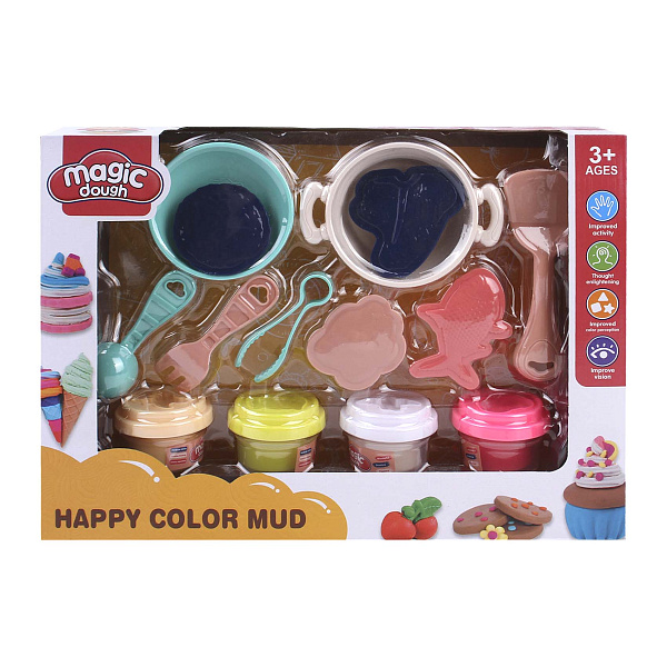 В наборе предусмотрено 14 предметов, включая инструменты и формочки. Эти элементы помогают создавать сложные дизайны и продумывать композиции. Формочки выполнены с детализированными узорами, что делает процесс лепки еще более увлекательным.