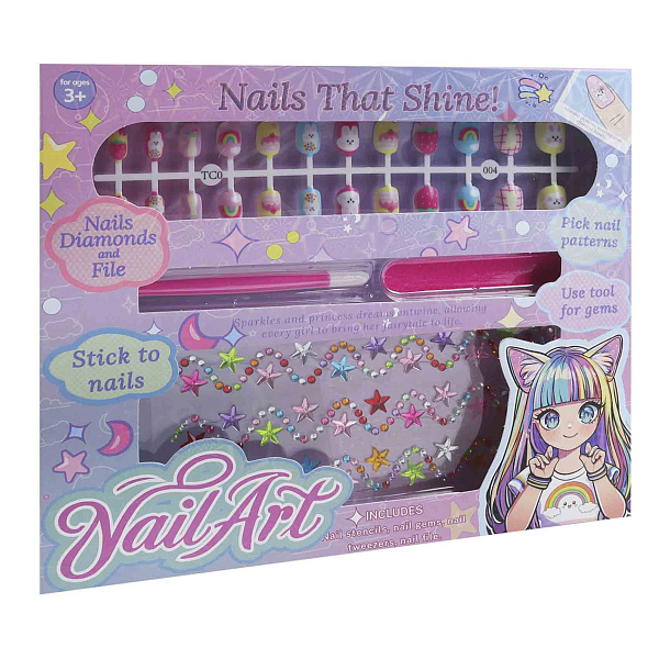 Яркий набор для создания маникюра содержит все необходимые элементы. В комплект входят накладные ногти разных размеров. Клеевые полоски фиксируют ногти без использования жидкого клея. Пилочка корректирует длину и форму. Палочка с удобным наконечником помогает размещать стразы. Разноцветные стразы добавляют дизайну яркости и индивидуальности.