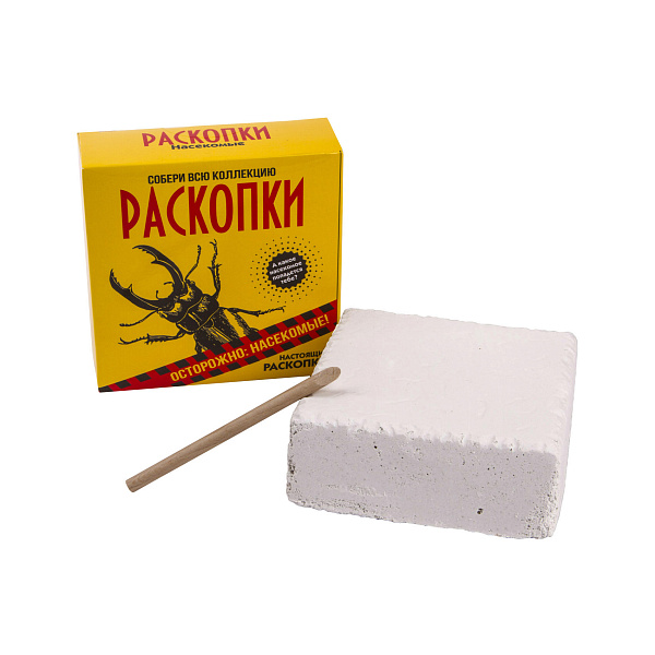 Оригинальный набор для маленьких исследователей позволит добыть настоящее, законсервированное в горных породах насекомое, чем приведет в восторг детей старше 6 лет. В набор входят гипсово-меловая плитка со скрытым внутри полимерным насекомым и деревянный стек для проведения работ.