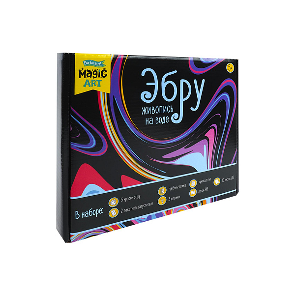 В комплект входят ванночка для воды, пакетики с загустителями, 5 баночек с красками, гребень-ложка, три шпажки, 10 листов бумаги формата А6 и руководство с подробным изложением правил рисования на воде.