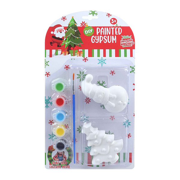 - В наборе: 2 гипсовые фигурки (снеговик и ёлка), 5 акриловых красок (зелёная, красная, голубая, жёлтая, чёрная), кисточка