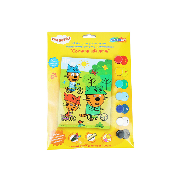 На листе картона размером 17 на 23 см нанесены контурные изображения трех котят – героев сериала. Все рисунки разбиты на мелкие фрагменты, каждый из которых имеет свой номер, обозначающий цвет. В процессе разукрашивания на месте переплетения черных линий появляется красочное изображение Компота, Коржика и Карамельки. Такой набор развивает художественные способности, формирует навыки изобразительного творчества.