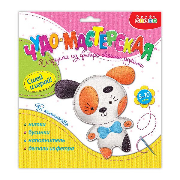 Игрушки из фетра всегда яркие и веселые. Играть ими – одно удовольствие, но еще интереснее – сшить самостоятельно. Набор для творчества содержит уже готовые материалы – вырезанные детали игрушки, нитки для шитья и вышивки мордочки, бусинки-глаза, наполнитель. Подробная инструкция позволяет справиться с работой даже девочке старше 5 лет, которая еще не имеет навыков шитья.