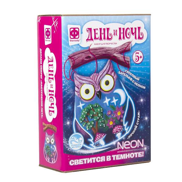 Эффектную сову, светящуюся в темноте, ребенок сможет смастерить сам. Для этого необходимо подарить ему готовый комплект из линейки «День-ночь», где есть все необходимое для работы. Гипс является безопасным природным материалом, а в составе остальных компонентов нет токсичных веществ. По этой причине процесс создания барельефа абсолютно безопасен. Важным завершающим штрихом является нанесение неонового пигмента на отдельные элементы изделия. После высыхания они будут светиться в темноте.