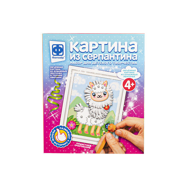 Увлекательное занятие можно предложить ребенку старше 4 лет. Дети с удовольствием займутся созданием оригинальной аппликации из кусочков серпантина. Узкие ленточки имитируют курчавую шерсть маленькой ламы. Придать изображению сказочное очарование помогут сверкающие пайетки, которые входят в набор. Творческий процесс надолго завладеет детским вниманием, положительно повлияет на воображение, логическое мышление, моторику рук. В коробке из прочного картона есть готовый шаблон и элементы, необходимые для работы. Материалы не содержат вредных веществ, опасных для детского организма.