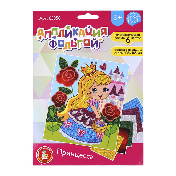 Аппликация фольгой «Принцесса» предлагает возможность создать яркую и красочную картину своими руками. В комплект входят шесть листов голографической фольги разных цветов и основа с клеящим слоем размером 138*165 мм. Яркая основа с изображением принцессы и замка станет отличным холстом для творчества.