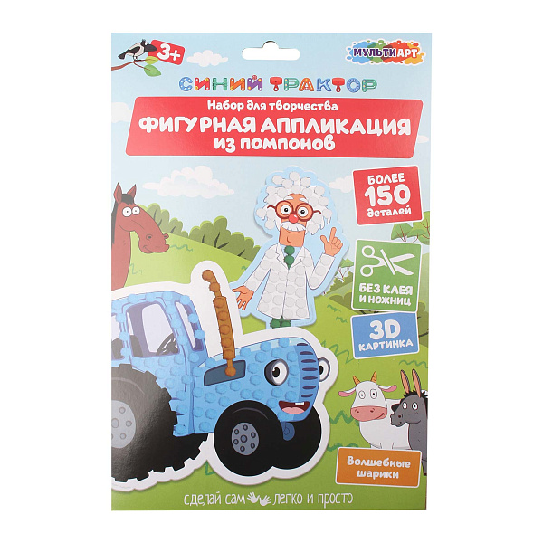 Набор для творчества «Аппликация из помпонов — Синий трактор» размером предлагает интересное и развивающее занятие, в ходе которого ребенок создаст объемную и яркую картинку с любимыми героями. В комплект включены две фигурные основы для аппликации и набор разноцветных мягких помпонов, которые легко прикрепляются к клеевой поверхности основы без использования ножниц и дополнительного клея. Такой творческий процесс способствует развитию мелкой моторики, усидчивости и воображения, дарит радость созидания и помогает в освоении навыков аккуратности.