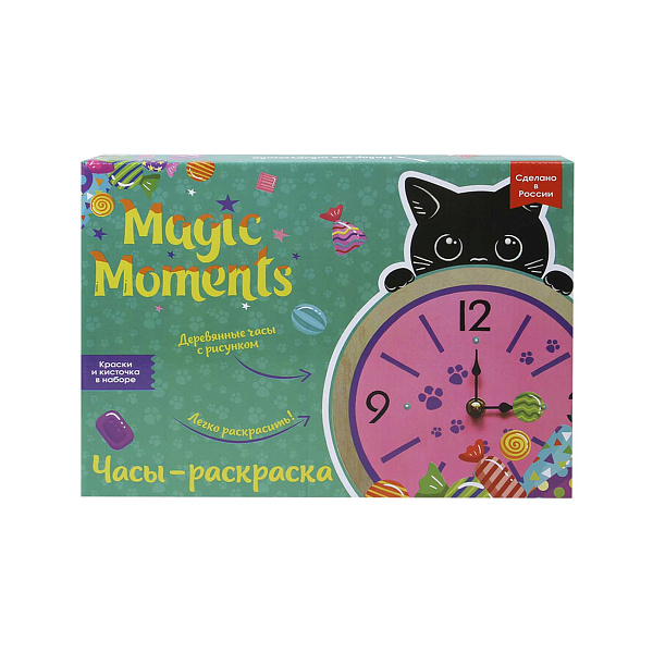 Набор «Часы-раскраска Котик» содержит корпус настенных часов с деревянным циферблатом и фигуркой котенка, часовой механизм, стрелки и комплект из шести акриловых красок с кисточкой.
