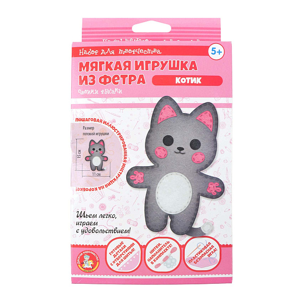 Набор для творчества «Мягкая игрушка из фетра: Котик» — это занимательный комплект для детей от 5 лет, предназначенный для самостоятельного изготовления мягкой игрушки в виде милого котёнка. В набор входят готовые детали из фетра с нанесённой разметкой для удобного шитья, разноцветные нитки, пластмассовая игла с большим ушком, а также наполнитель для придания игрушке объёма.