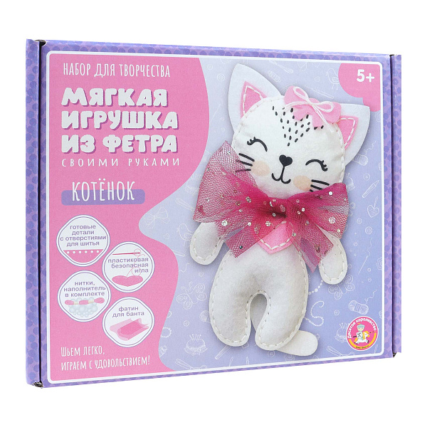 Набор для творчества «Мягкая игрушка из фетра: Котёнок» — это увлекательный рукодельный комплект для детей от 5 лет, позволяющий самостоятельно создать мягкую игрушку в виде милого котёнка. В наборе имеются готовые детали из фетра с отверстиями для шитья, пластиковая безопасная игла, разноцветные нитки, наполнитель для объема и фатин для украшения банта.