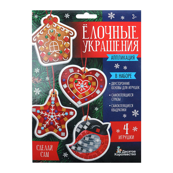 Набор для творчества «Елочные украшения» предлагает детям создать яркие и оригинальные новогодние игрушки своими руками. В комплект входят четыре двусторонние картонные основы с праздничными рисунками, самоклеящиеся стразы пяти цветов и разноцветные квадратные элементы для декорирования, а также подробная инструкция.