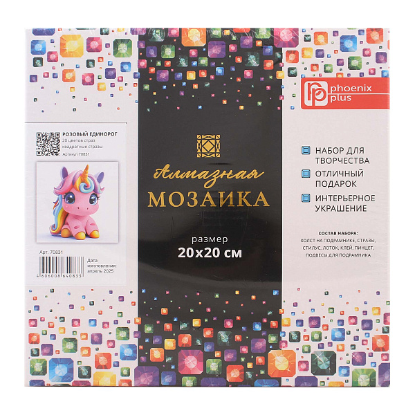 Набор для творчества «Алмазная мозаика Единорог» — это увлекательный и творческий процесс создания яркой блестящей картины с изображением розового единорога. В комплекте представлены высококачественные акриловые стразы 20 различных оттенков, которые придают работе особое сияние и объемность. В состав набора входят холст на подрамнике с напечатанной картиной и клеевым слоем, удобный стилус для крепления страз, лоток, клей, пинцет для точной работы и подвесы для готовой картины.