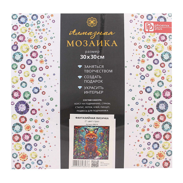 Набор для творчества «Алмазная мозаика Фантазийная лисичка» предлагает захватывающий процесс создания яркой и сверкающей картины с помощью разноцветных страз. В комплекте — холст на подрамнике с напечатанной схемой и клеевым слоем, набор из 21 оттенка страз, удобный стилус для точного крепления камешков, лоток, пинцет, клей, а также подвесы для готовой работы.