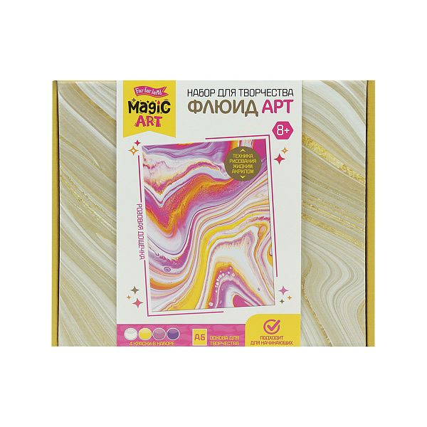 Набор для творчества «Флюид Арт» станет чудесным подарком для начинающего художника. «Флюид Арт» – это техника рисования жидким акрилом, который позволяет создавать неповторимые картины. В набор входят: заготовка под заливку формата А5, краски 4 цветов (белый, желтый, розовый, фиолетовый), перчатки, трубочка, а также палочки для размешивания. На обороте коробке напечатана пошаговая инструкция, которая поможет ребенку сотворить оригинальную картину. В процессе творчества юный художник развивает моторику рук, усидчивость, аккуратность, умение работать с цветами и раскрывает творческий потенциал. Рекомендовано для детей старше 8 лет.