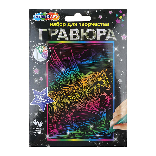 Набор для творчества «гравюра цветная. Пегас»— творческий набор, который позволяет легко создать яркое и эффектное изображение мифического крылатого коня пегаса с помощью специальной техники гравировки. В основе набора — лист с нанесённым контуром рисунка на чёрном фоне и цветной подложкой, которая проявляется при нанесении царапающих штрихов.