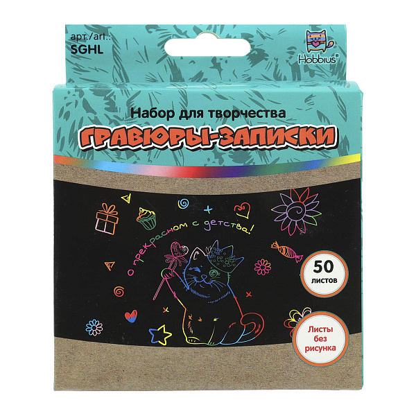Набор гравюры-записки без рисунка предлагает попробовать малышам новое творческое направление. В комплект входит пятьдесят отдельных разноцветных листочков, покрытых сверху специальным черным слоем. Чтобы получился красивый рисунок, нужно счистить часть покрытия специальным металлическим шпателем, который также есть в наборе. Сюжет зависит от фантазии ребенка.