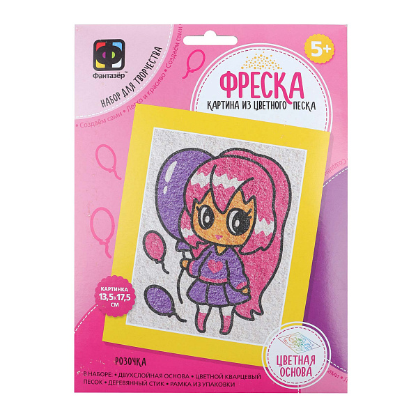 Набор для творчества «фреска. Картина из цветного песка» — интересный набор для детей от 5 лет, позволяющий создать яркую картину с изображением милой девочки в стиле аниме, используя цветной кварцевый песок. В набор входит двуслойная основа с изображением, цветной песок, деревянный стик для точного нанесения песка, а также рамка (в наборе — из упаковки).