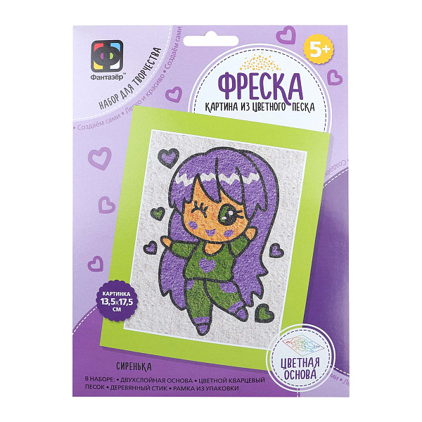 Набор для творчества «Фреска. Картина из цветного песка» — увлекательный материал для детского творчества и развития мелкой моторики. В наборе содержится двухслойная основа с нанесённым рисунком, цветной кварцевый песок разных оттенков (белый, чёрный, сиреневый, зелёный, охристый), деревянная палочка для аккуратного нанесения песка и инструкция.