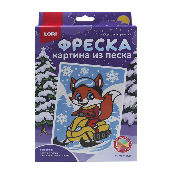 Набор для творчества «Фреска Лиса» представляет собой увлекательное занятие по созданию яркой картины из цветного песка на самоклеящейся основе с изображением милой лисы на снегоходе. В комплект входят разноцветный песок семи оттенков и основа с нанесенным контуром рисунка для точного и простого заполнения.