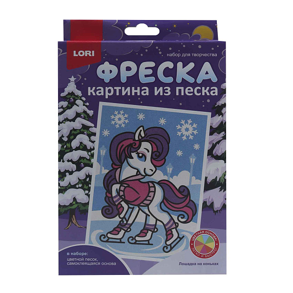 Набор для творчества «Фреска. Лошадка на коньках» — это интересное занятие, позволяющее создать яркую картину из цветного песка с изображением милой лошадки на коньках. В комплект входят самоклеящаяся основа с контурным рисунком и набор разноцветного песка в пакетиках.
