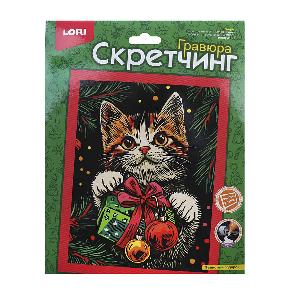 Набор для творчества «Скретчинг. Пушистый подарок» представляет собой гравюру с черным покрытием и нанесенным контуром изображения милого котенка с новогодним подарком. В комплект входит основа с рисунком, специальный штрихель для аккуратного удаления верхнего слоя и подробная инструкция.