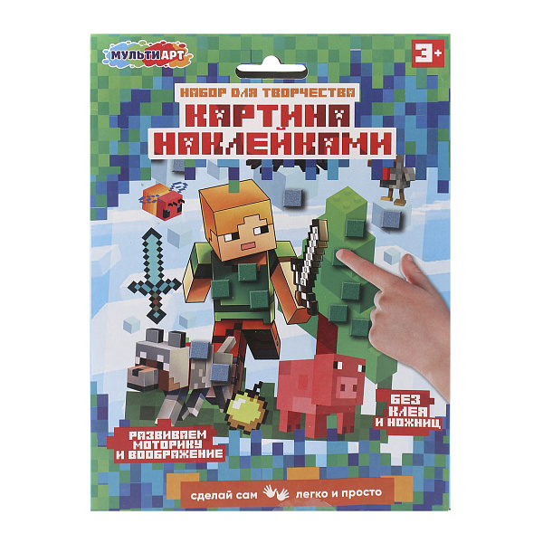 Набор для творчества «Картина наклейками. Мир Пикселей» предлагает увлекательный и простой процесс создания яркой картины в современном пиксельном стиле. Ребенок с легкостью соберет красочное изображение, последовательно наклеивая на основу объемные детали и декоративные стикеры. В комплект входят прочная пластиковая основа, самоклеящиеся мягкие детали двух цветов, 2 листа тематических наклеек, двусторонняя клейкая лента для сборки и картонная подставка для готовой работы.